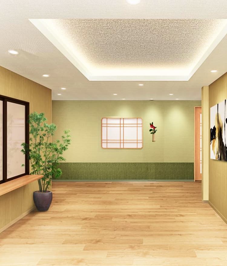 - 空間のポイントとして間接照明を取り入れ、エントランス正面の扉にもデザインを入れることで明るく高級感のある印象に。
