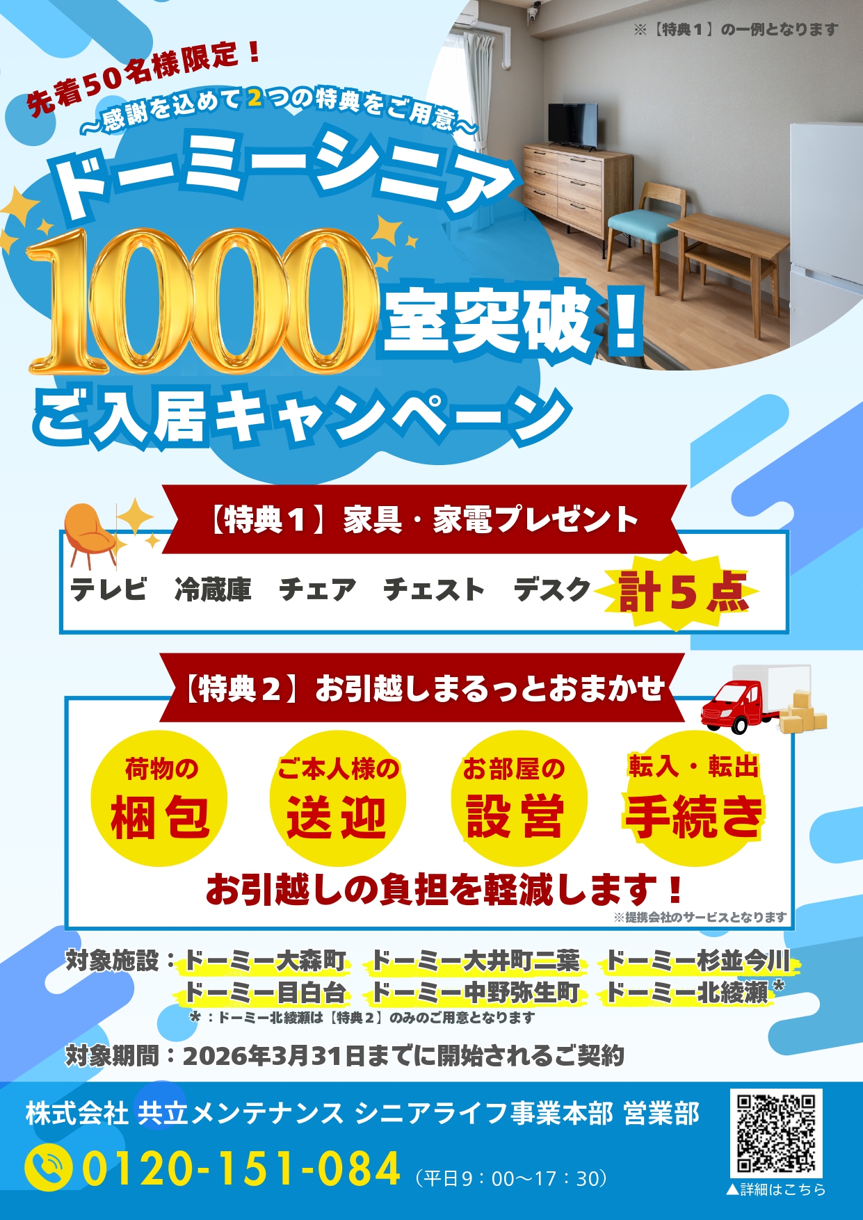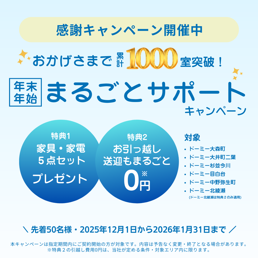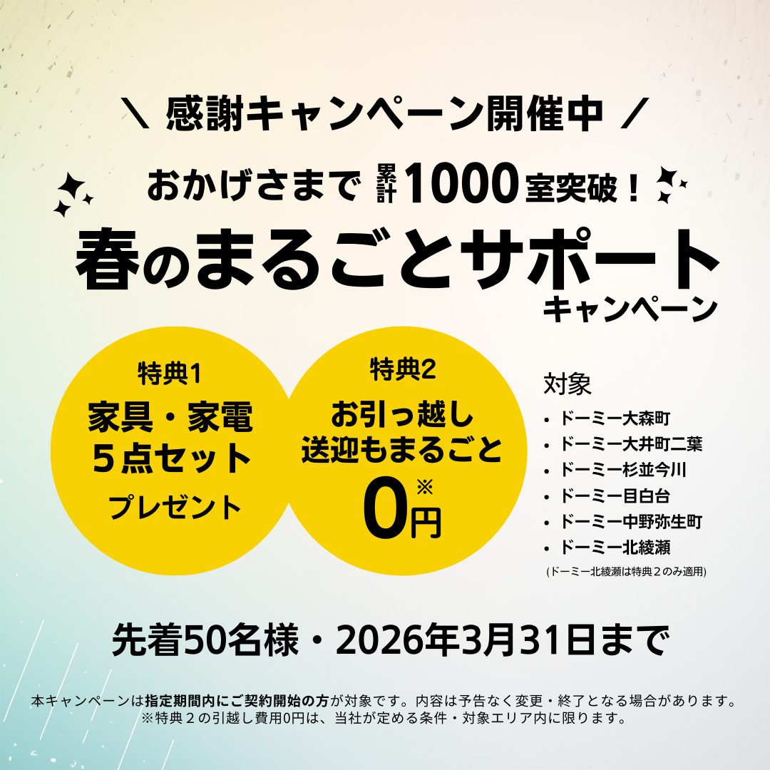 ドーミー大森町/大井町二葉/杉並今川/目白台/中野弥生町/北綾瀬(※北綾瀬は特典②のみ)