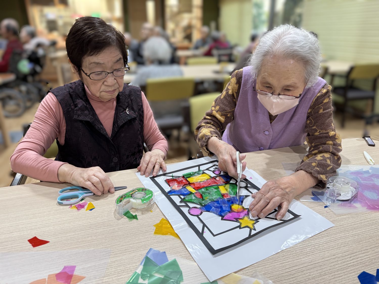 土台は職員が作成し、お客様に色のついたセロハンを自由に貼っていただき完成させました!