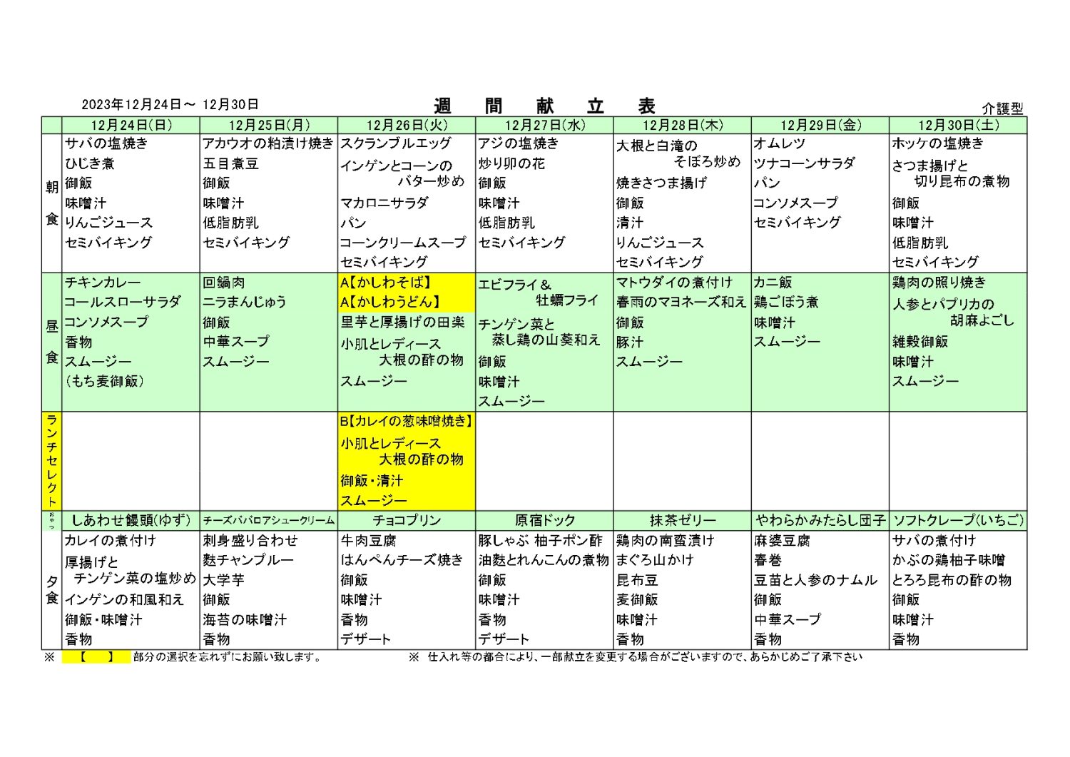 また、仕入れ状況等により献立に変更がある場合がございますので